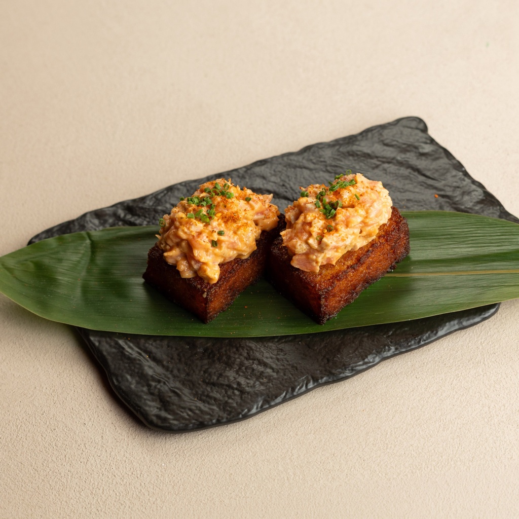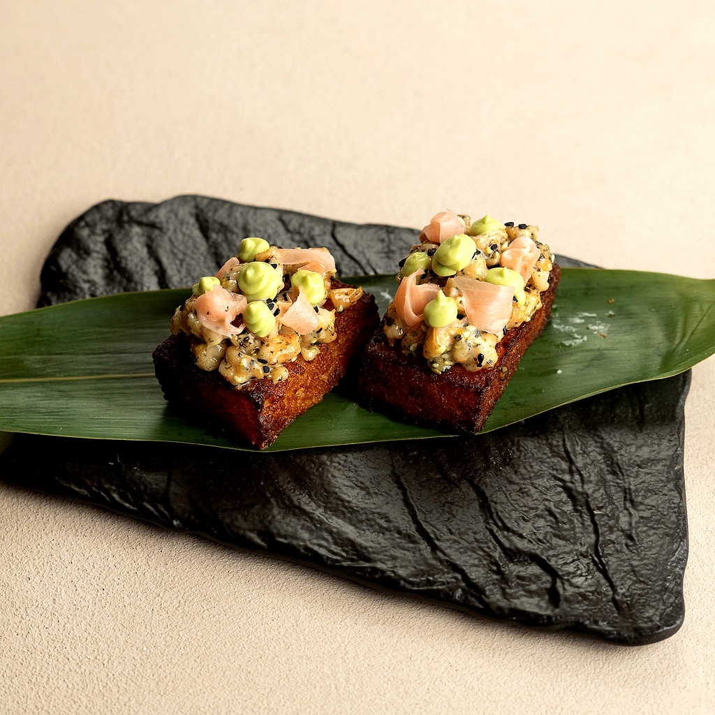 Crispy rice squares topped with tuna, sriracha aioli, and spring onion