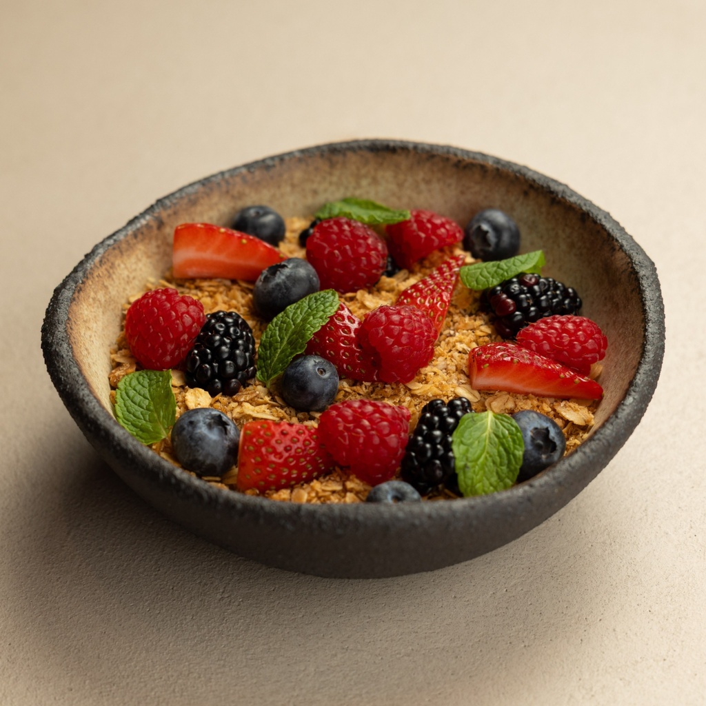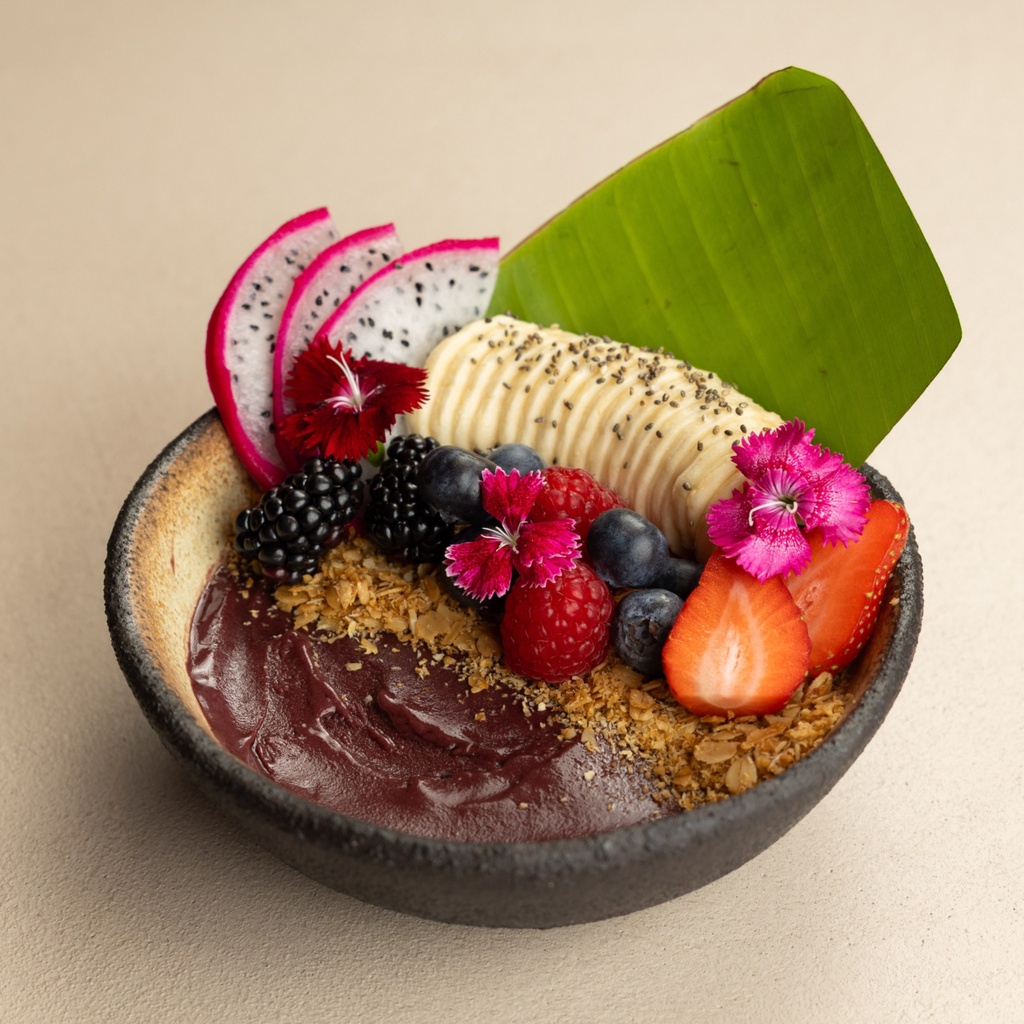 Açaí with coconut granola, dragon fruit, fresh mix berries, banana and chia seeds.