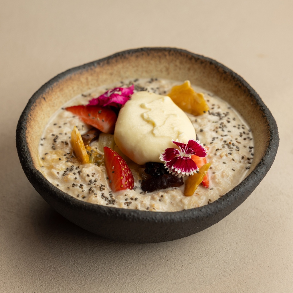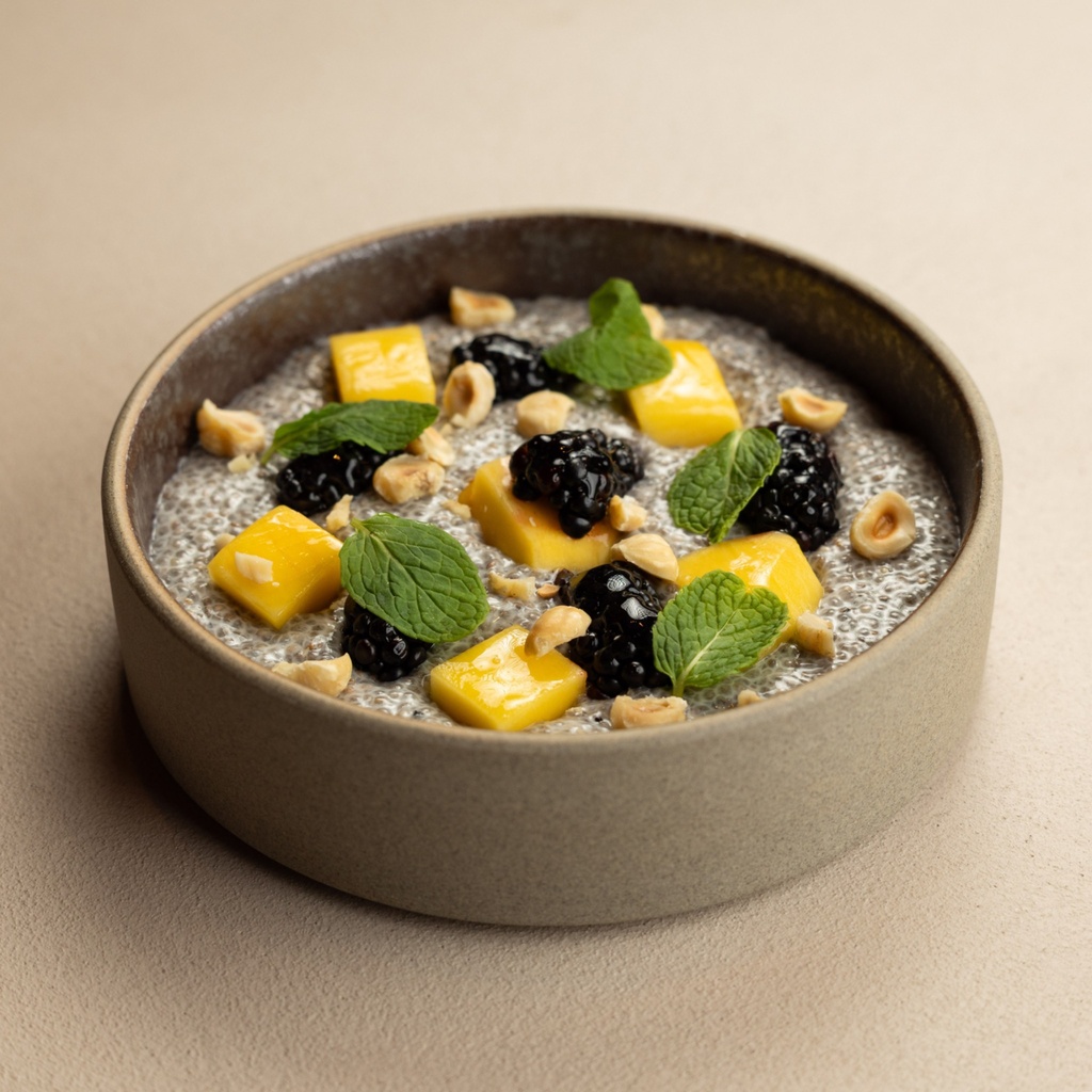Almond chia pudding with mango sauce, blackberries, fresh mango, and crushed hazelnuts.