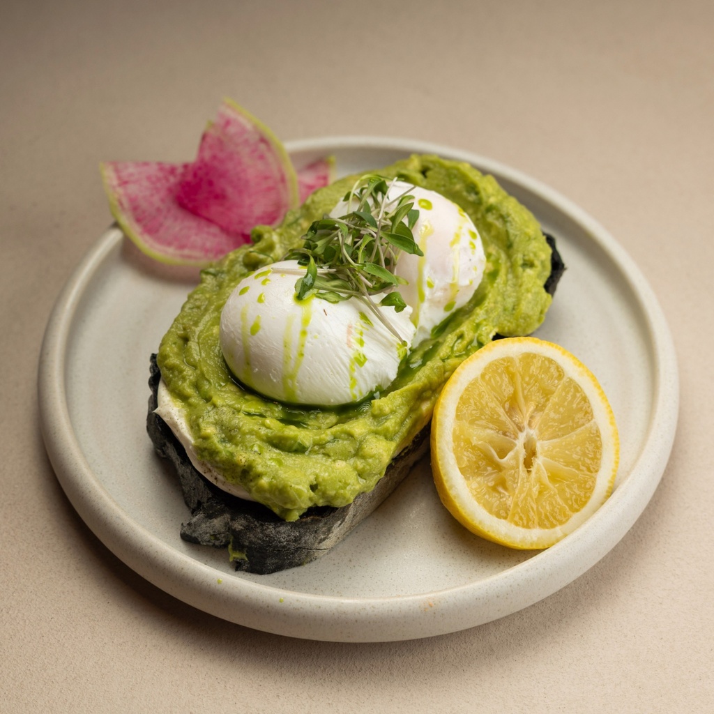 Creamy smashed avocado and whipped cream cheese on toasted charcoal rye bread, topped with soft-poached eggs.