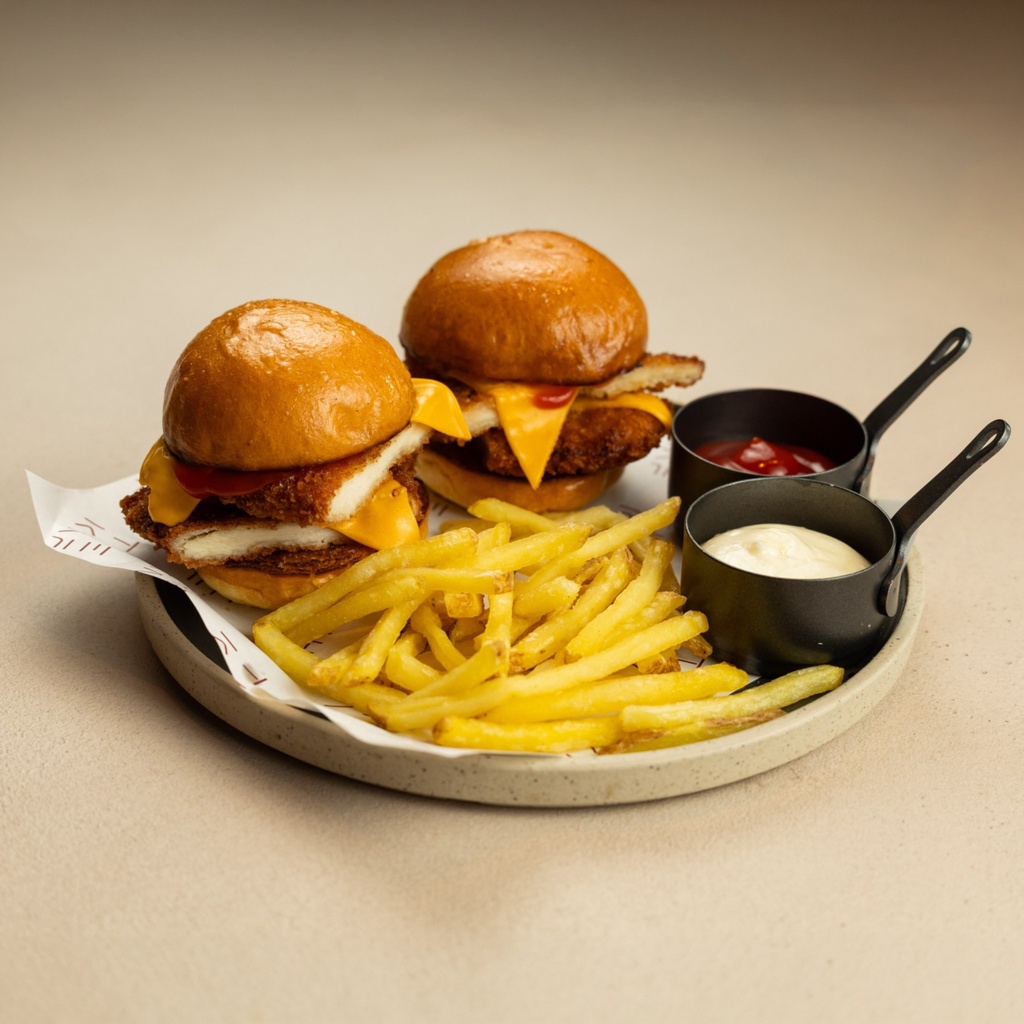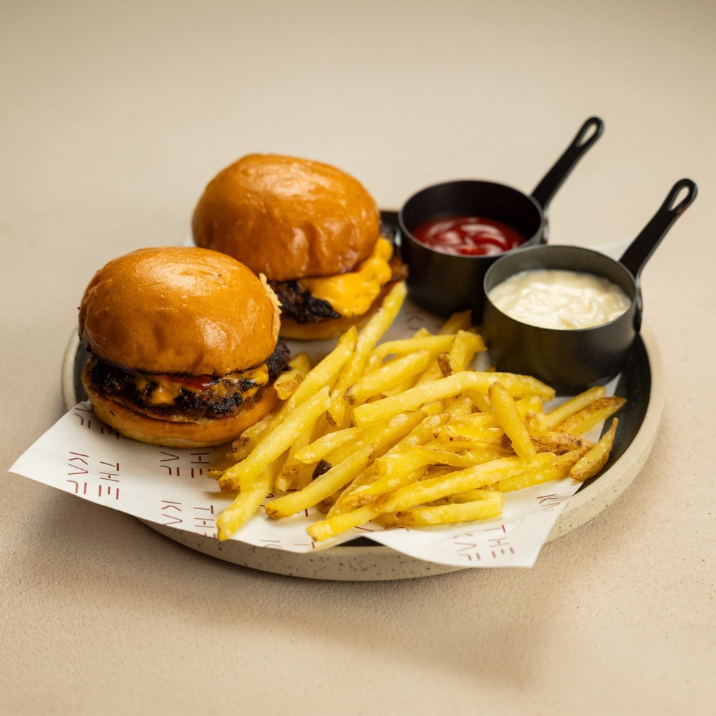 Wagyu beef patty with truffle aioli, cheddar, pickles, and French fries.
