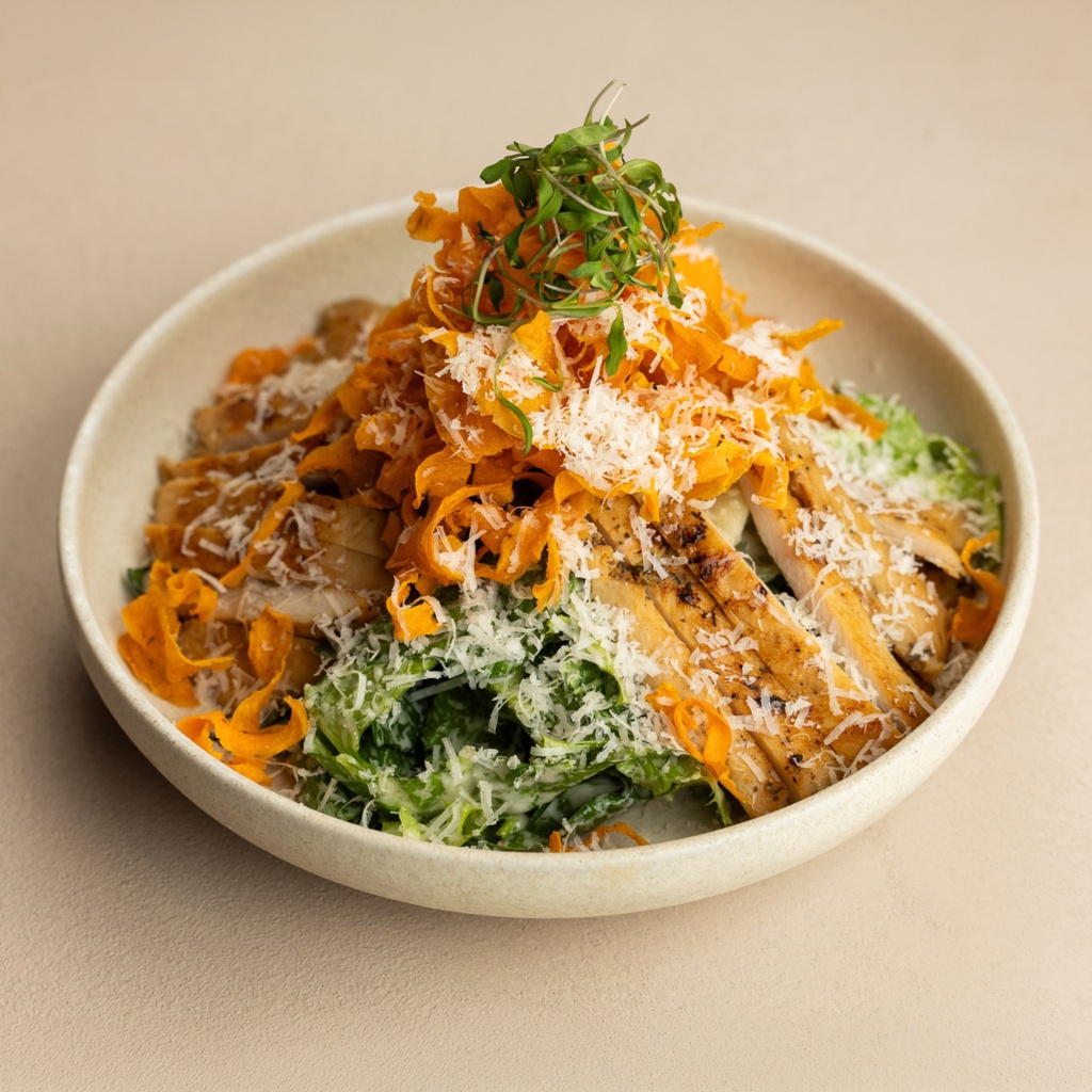 Romaine, spinach, and frisée lettuce with classic Caesar dressing, Parmesan, Cajun sweet potato, and crispy spiced Cajun chicken.