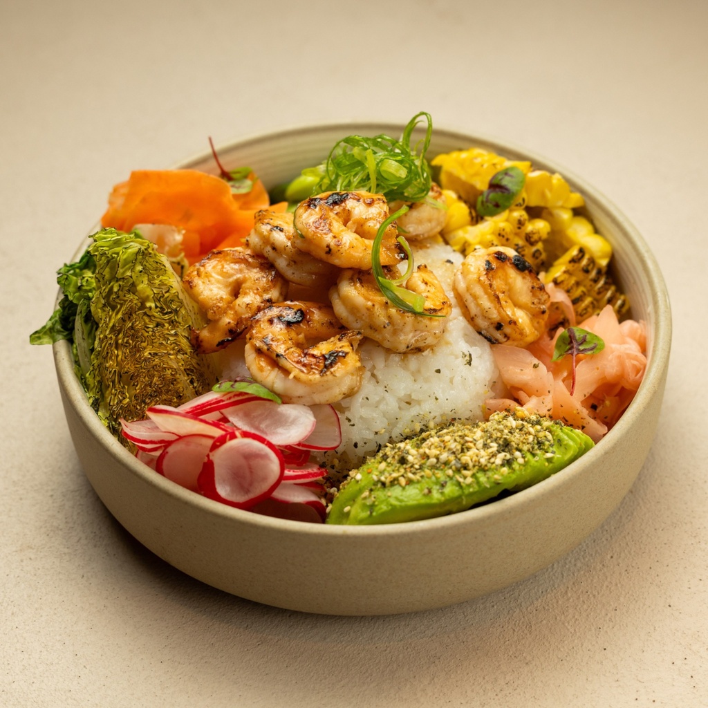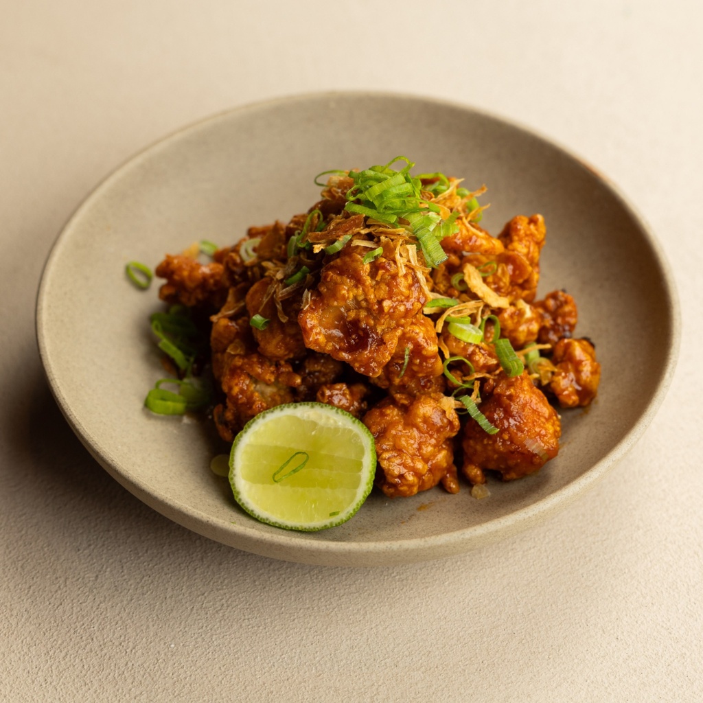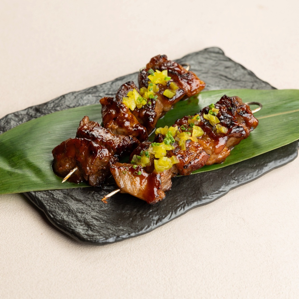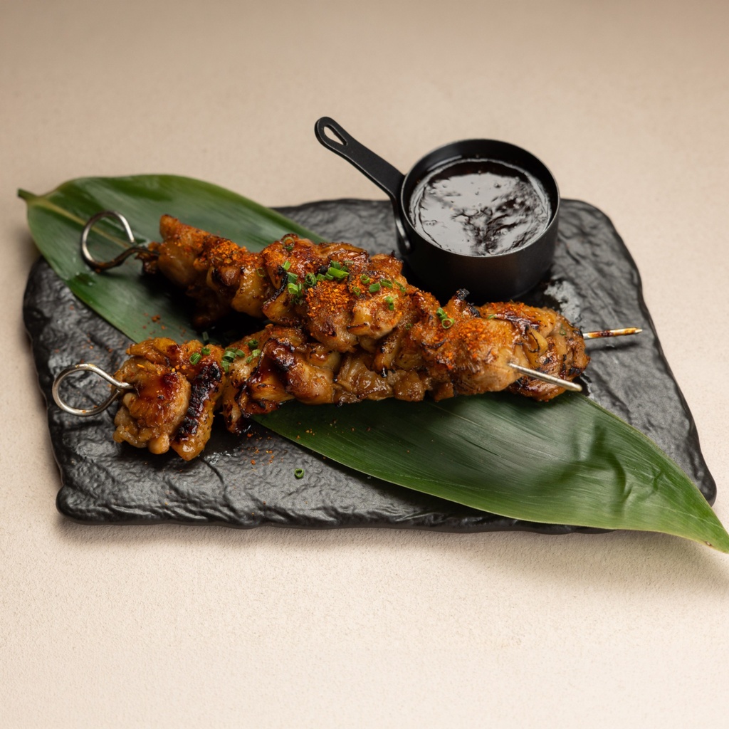 Tender skewered chicken grilled to perfection and brushed with a savory-sweet glaze, finished with sesame, spring onions and togarashi powder.