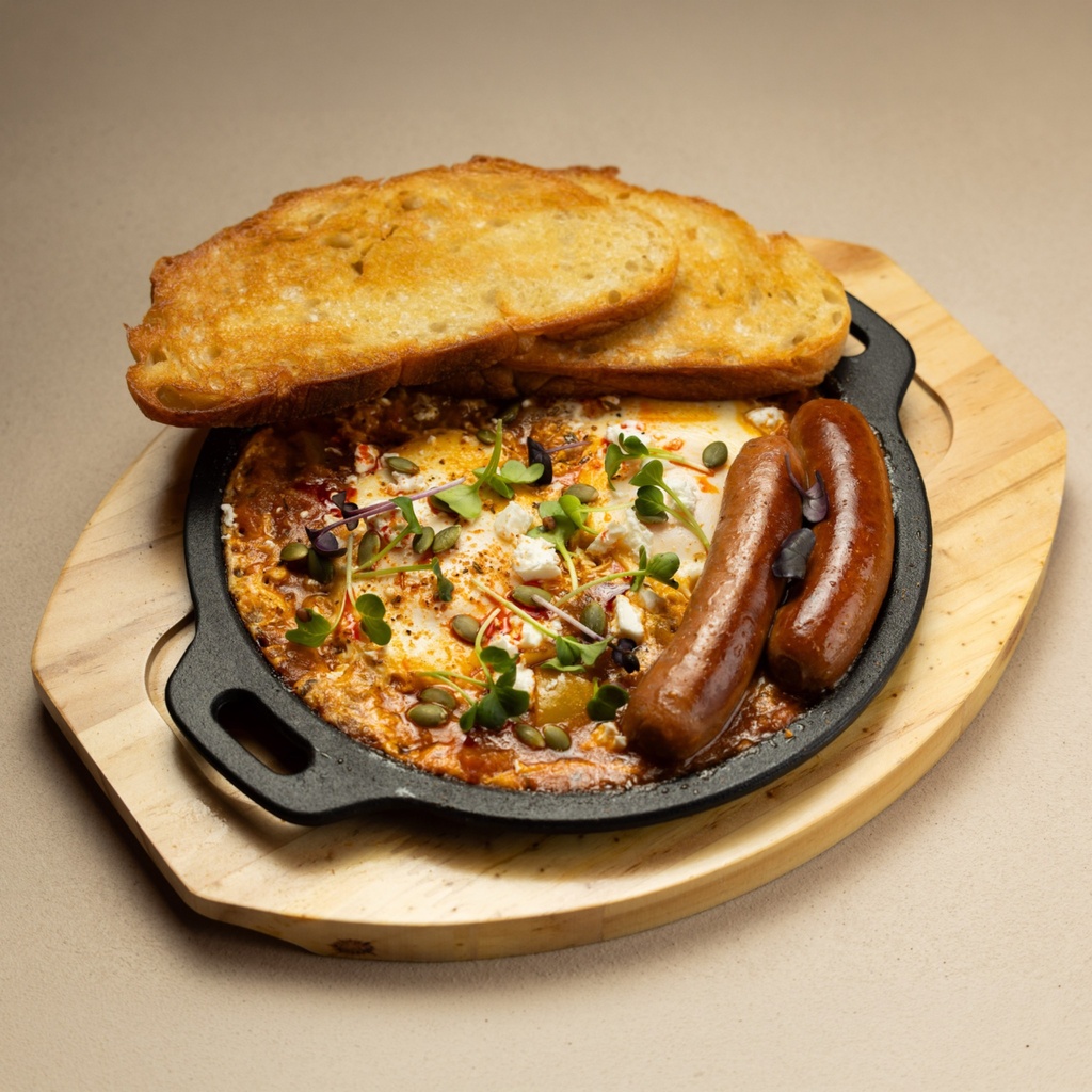 Authentic spiced shakshuka with beef sausage and perfectly cooked eggs, served with sourdough bread, crumbled Greek feta and fresh green cress.