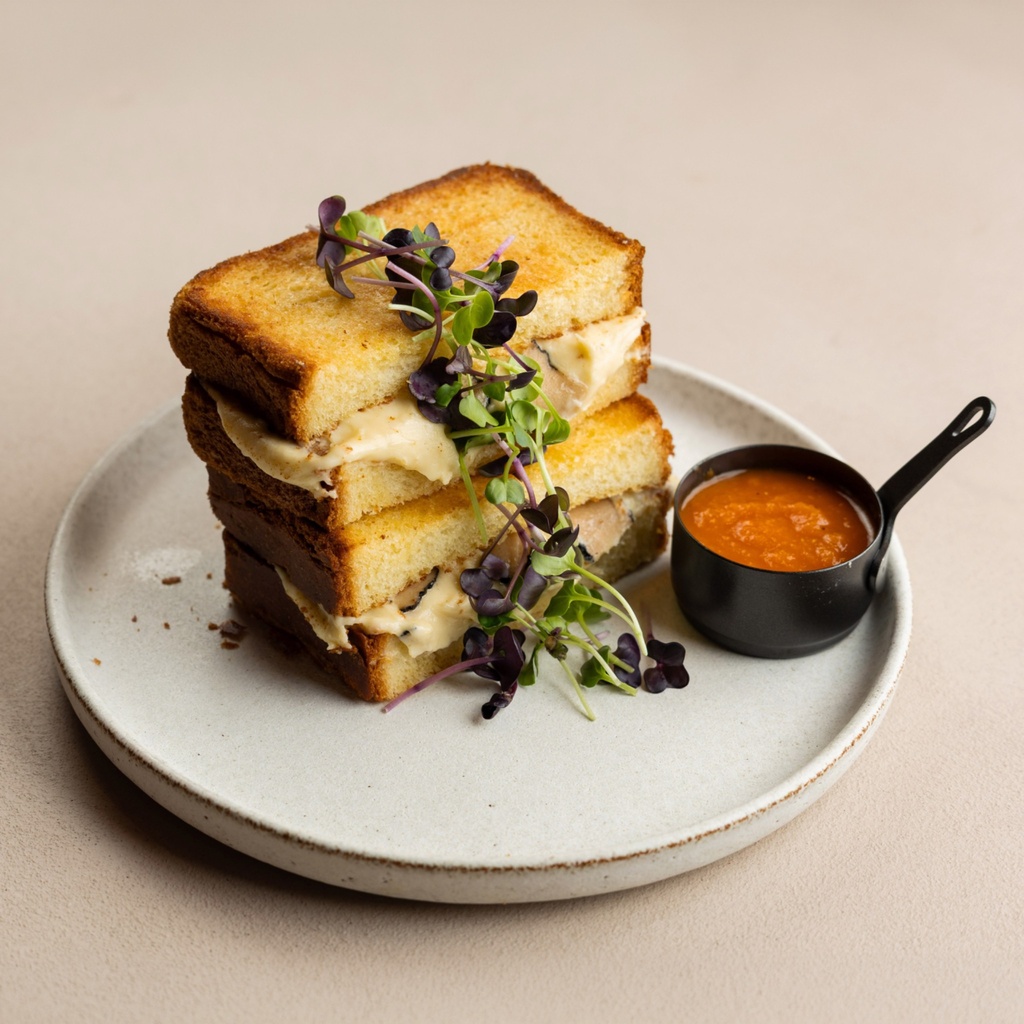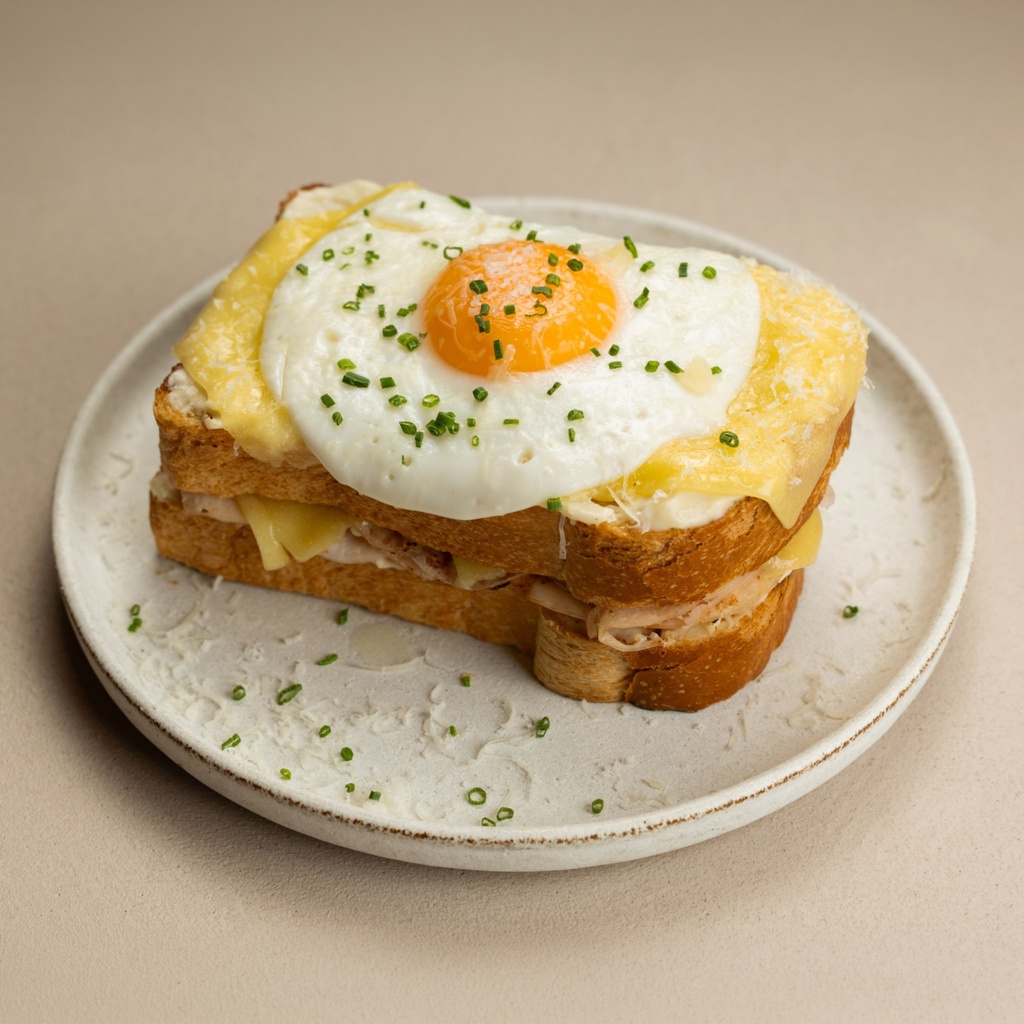 A decadent twist on the classic French sandwich with tender ham and melted cheese, topped with silky infused béchamel and a perfectly fried egg.