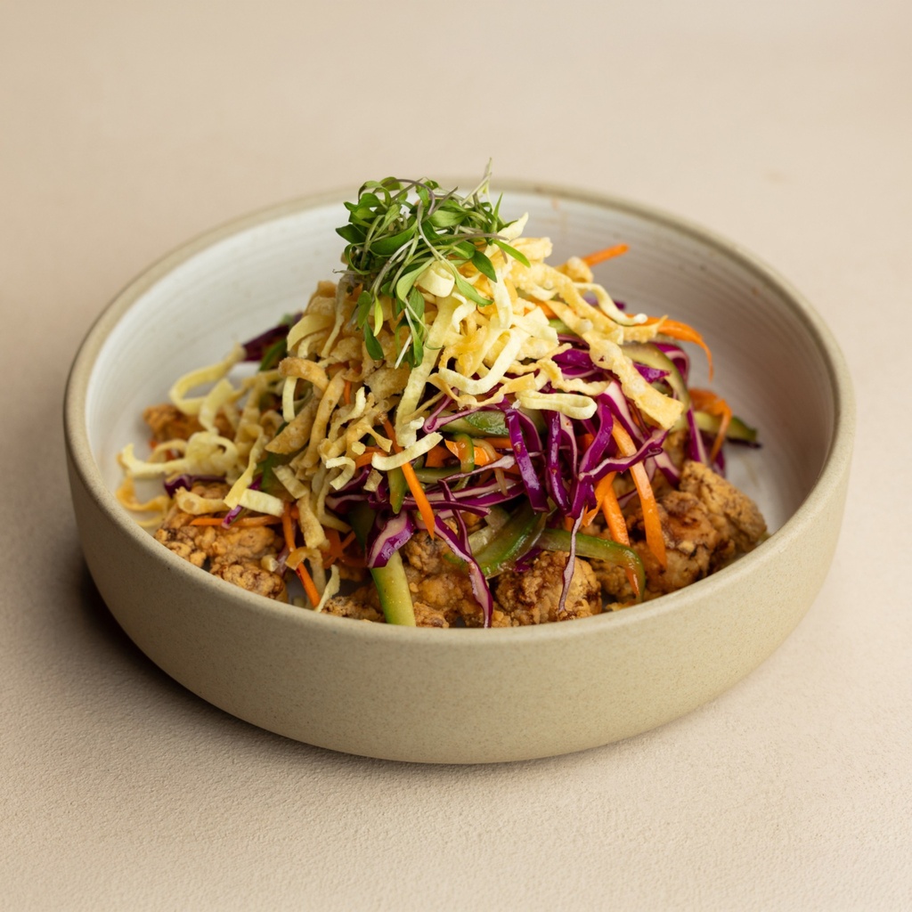Chicken with peanut sauce, crispy wonton, red cabbage cucumber, and carrot, lightly tossed in Asian dressing.