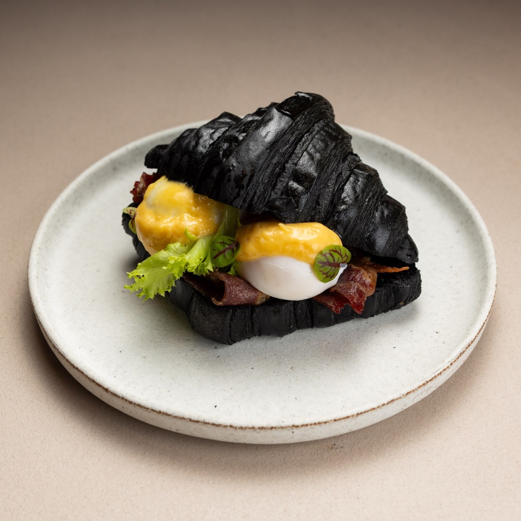 Flaky butter charcoal croissant layered with crispy smoked beef bacon and soft-poached eggs, topped with silky hollandaise sauce and served with a fresh garden garnish.