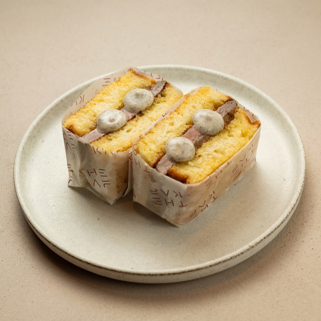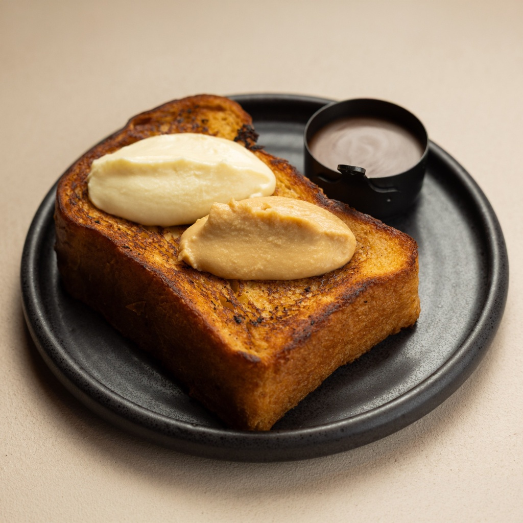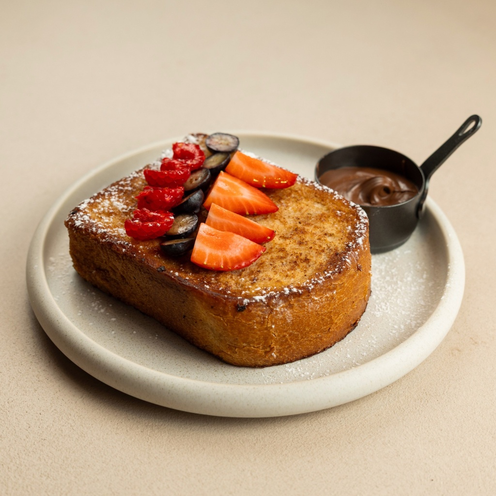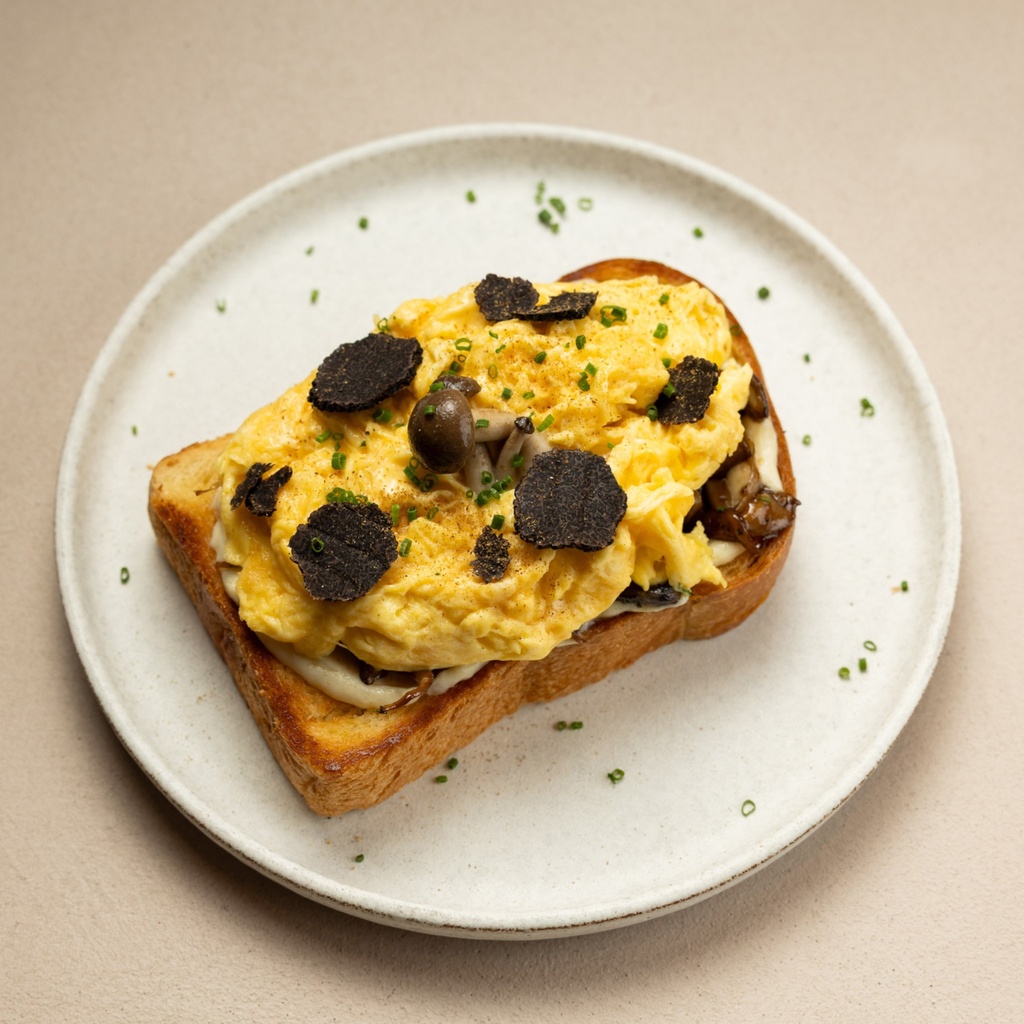 Silky scrambled eggs on toasted brioche, topped with rich truffle béchamel, balsamic-glazed mushrooms, fresh herbs, and shaved black truffle.