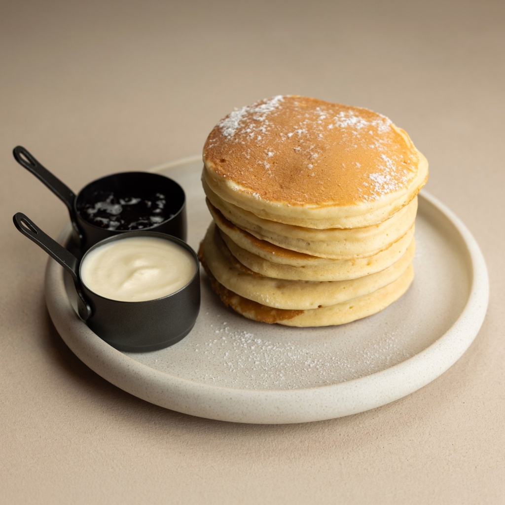Cottage cheese pancakes with blackcurrant jam, fresh mix berries and sour cream.