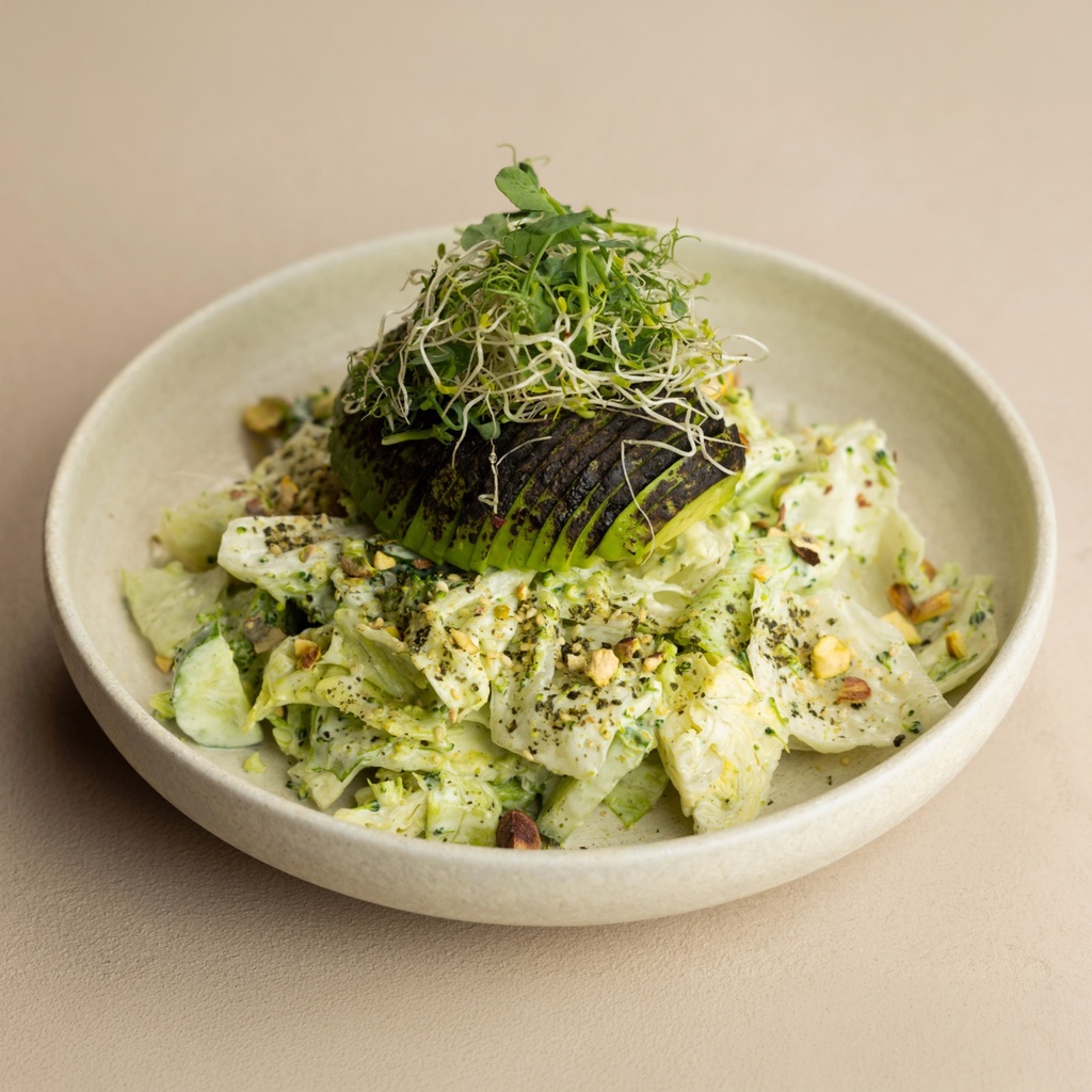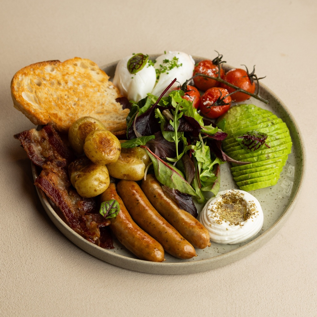 Served with labneh zaatar, roasted tomato, baby potatoes, mixed greens, chicken sausage, beef bacon, avocado, and poached eggs.