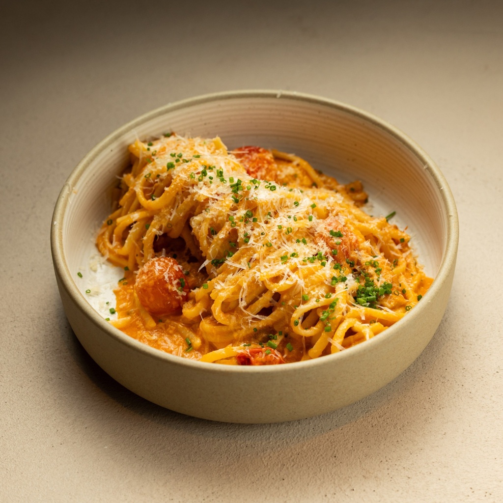 Al dente linguine tossed with homemade spicy sambal sauce, chicken, cherry tomatoes, chives, cream, and Parmesan.