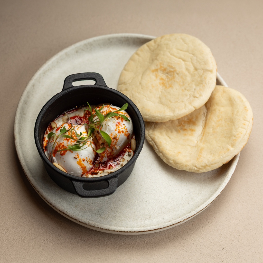 Roasted garlic labneh topped with roasted pepitas, chili oil and herb-infused oils, crumbled Greek feta, sumac, finished with coriander cress and served on toasted pita bread.