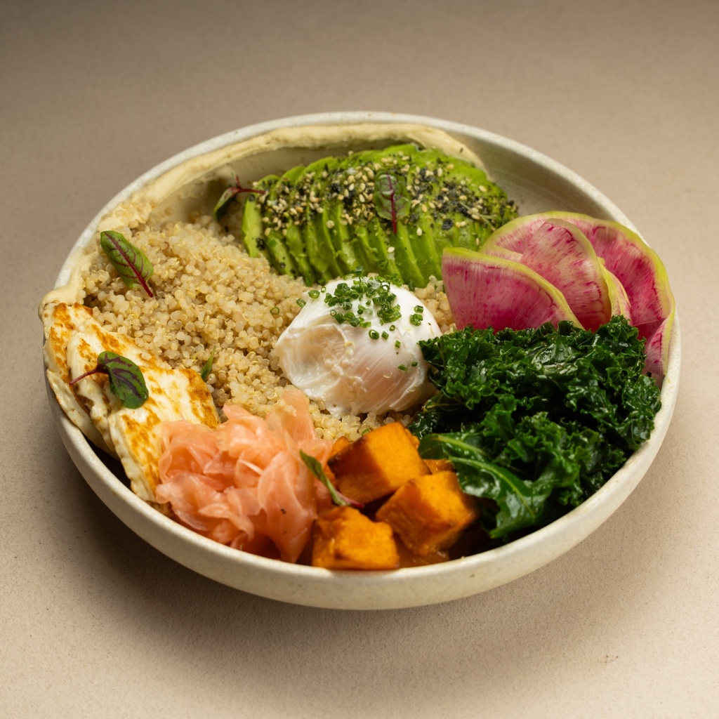 A vibrant bowl of alfalfa sprouts, creamy hummus, fresh sliced avocado, kale, and pickled ginger, paired with harissa-roasted butternut pumpkin, grilled halloumi